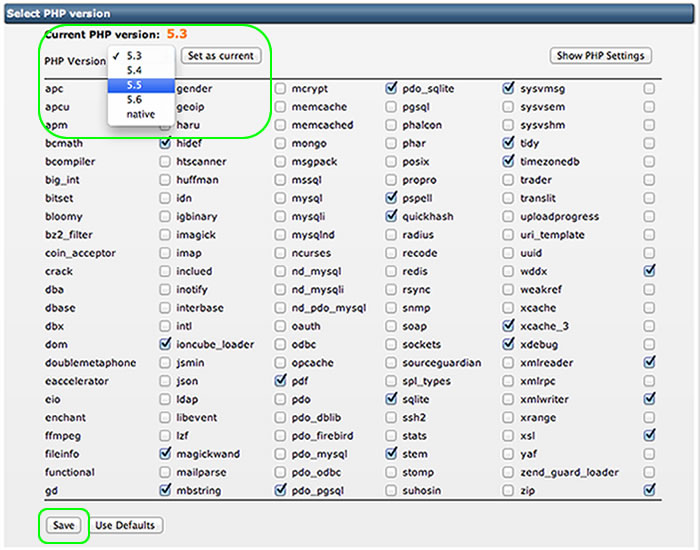 Nadat je een versie hebt ingesteld, kun je ook nog specifiek bepaalde PHP-modules in- of uitschakelen:
